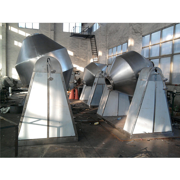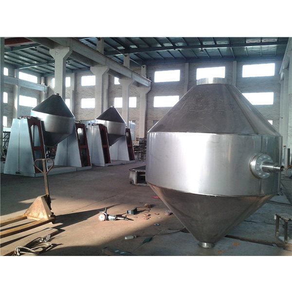 雙錐回轉真空干燥機為雙錐形的回轉罐體,罐內在真空狀態下,向夾套內通入蒸汽或熱水進行加熱,熱量通過罐體內壁與濕物料接觸,濕物料吸熱后蒸發的水汽,通過真空泵經真空排氣管被抽走。由于罐體內處于真空狀態,且罐體的回轉使物料不斷的上下內外翻動,故加快了物料的干燥速度,提高干燥效率,達到均勻干燥的目的。雙錐回轉真空干燥機系統主要由雙錐回轉真空干燥機、冷凝器、除塵器、真空抽氣系統、加熱系統、冷卻系統、電控系統等組成。