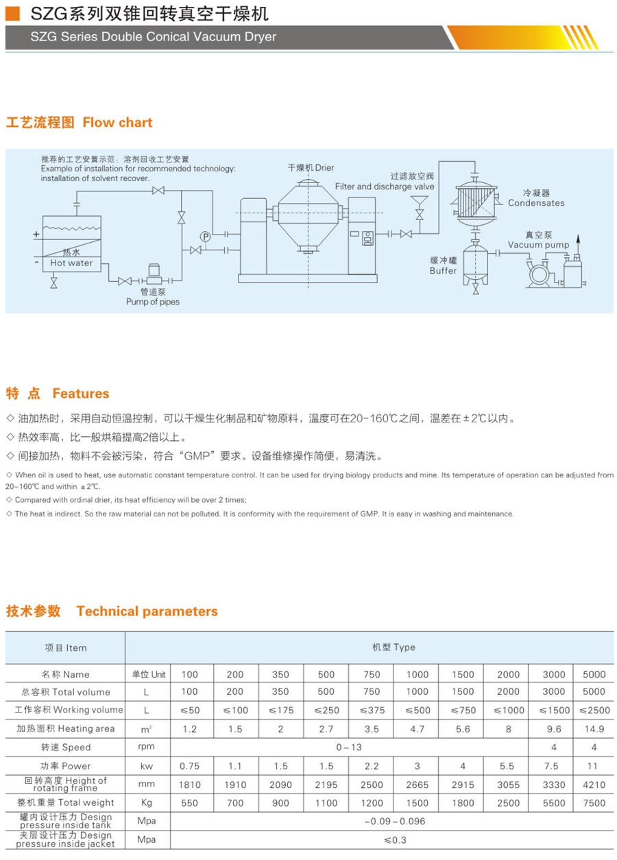 在密閉的夾層中通入熱能源(熱水、低壓蒸汽或導熱油),熱量經內殼傳給被干燥物料。在動力驅動下,罐體作緩慢旋轉,罐內物料不斷地翻動、混合,從器壁內表面接受熱量,從而達到強化干燥的目的。物料處于真空狀態,蒸汽壓下降使物料表面的水份(溶劑)達到飽和狀態而蒸發了,并由真空泵及時排出回收。物料內部的水分(溶劑)不斷地向表面滲透、蒸發、排出,三個過程不斷進行,物料在短時間內達到干燥目的。
