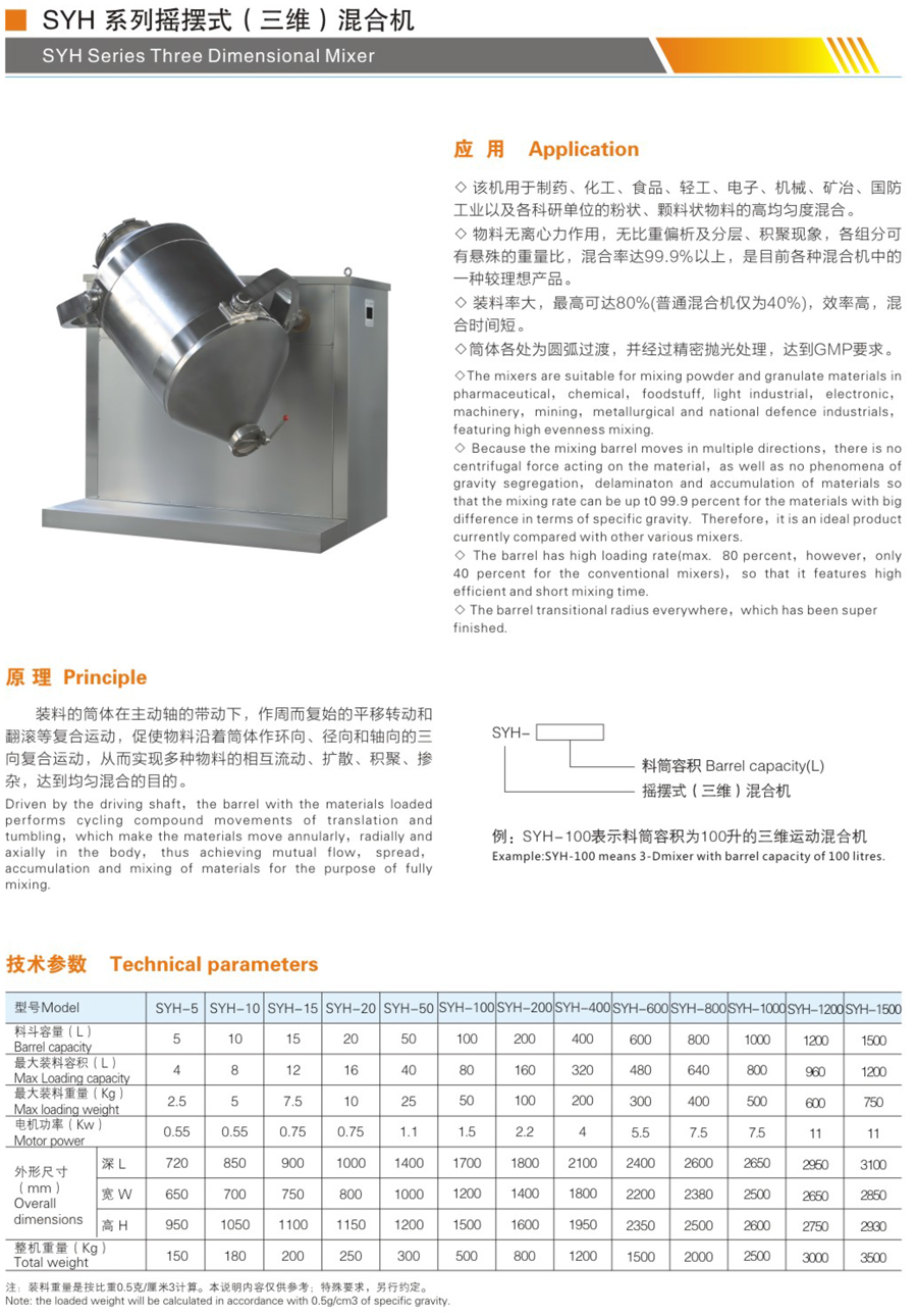 本機混合筒多方向運動,物料無離心力作用,無比重偏析及分層、積聚現象,各組分可有懸殊的重量比,混合率高,是目前各種混合機中較理想產品。