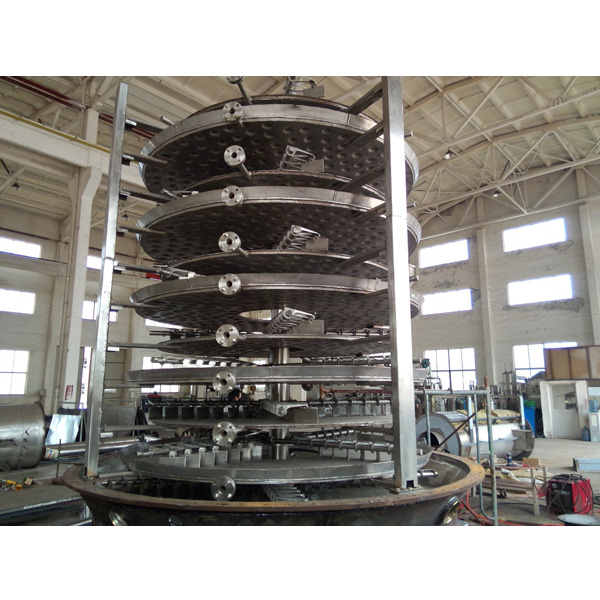濕物料自加料器連續(xù)地加到干燥器上部第一層干燥盤上,帶有耙葉的耙臂作回轉(zhuǎn)運動使耙葉連續(xù)地翻抄物料。物料沿指數(shù)螺旋線渡過干燥盤表面,在小干燥盤上的物料被移送到外緣,并在外緣落到下方的大干燥盤外緣,在大干燥塔上物料向里移動并從中間落料口落入下一層小干燥盤中。大小干燥盤上下交替排列,物料得以連續(xù)地流過整個干燥器。中空的干燥盤內(nèi)通入加熱介質(zhì),加熱介質(zhì)形式有飽和蒸汽、熱水和導熱油,加熱介質(zhì)由干燥盤的一端進入,從另一端導出。已干物料從最后一層干燥盤落到殼體的底層,最后被耙葉移送到出料口排出。濕份從物料中逸出。由設在頂蓋上的排濕口排出,真空型盤式干燥器的濕氣由設在頂蓋上的真空泵抽出。從底層排出的干物料可直接包裝。通過配加翅片加熱器、溶劑回收冷凝器、袋式除塵器、干料返混木結(jié)構(gòu)、引風機等輔機,可提高其干燥的生產(chǎn)能力,干燥膏糊狀和熱敏性物料,可方便地回收溶劑,并能進行熱解和反應操作。