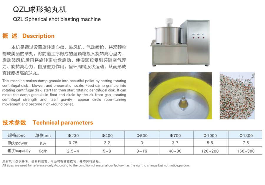 通過特別設計的轉子結構,使各種濕顆粒加工成美麗的球形粒,是制備膠囊、中藥丸劑的理想設備。